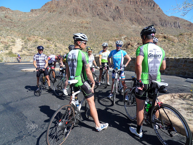After cresting the front side of Gates Pass I got to be part of the speed fest around McCain Loop with some Uber Bikers, then down to the end of the road and up the hill to the Visitor Center. After refueling, pictures, and biology breaks we headed back out to McCain Loop in reverse and then headed up to the back side of Gates Pass and WHOA nelly is it steep but we did and then flew home, nearly. Upon arriving home we made for our rooms only to return ready to run. Because a few of us have an Ironman as an "A" race we had to run 45 minutes. We went a little long and made it a cool 6 miles. Deets below, sorry no running pics today.